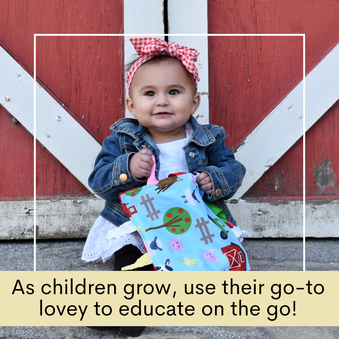 Your child will love all of the adorable sheep, cows, duck, and horses on our Farm Lovey and have fun counting the rectangles and squares in the red barn! It's the perfect security blanket that will last you forever and help with basic learning.. As your child grows up, the patterns will encourage your child to learn basic shapes and colors. The Learning Lovey is accented with coordinating ribbons that are sewn shut, so little fingers do not get intertwined in the ribbon loops. The variety of textured ribbons and fabrics encourage tactile play and help children develop cognitively, socially and emotionally through sensory interaction.