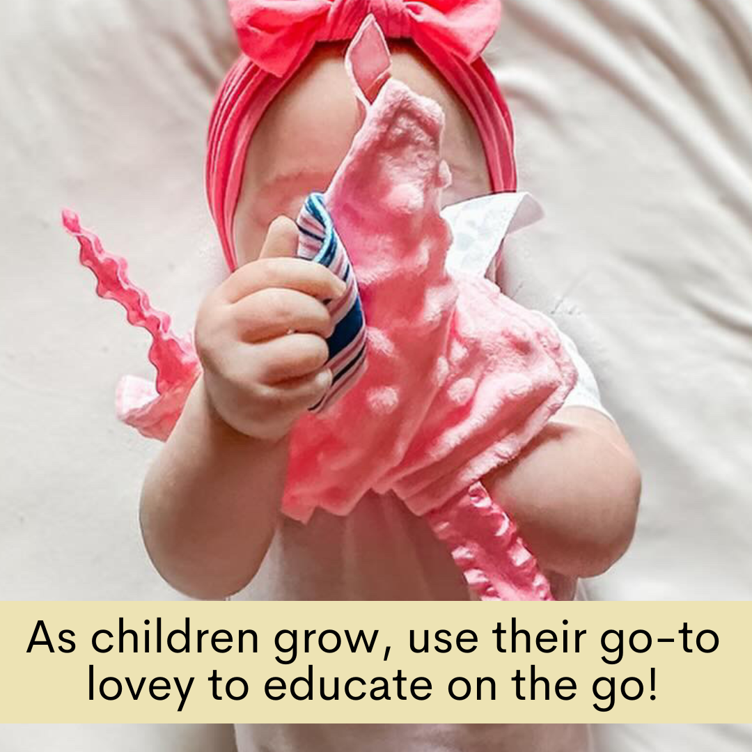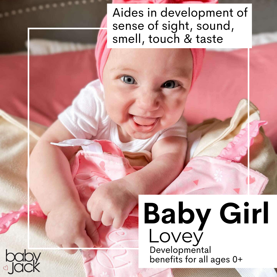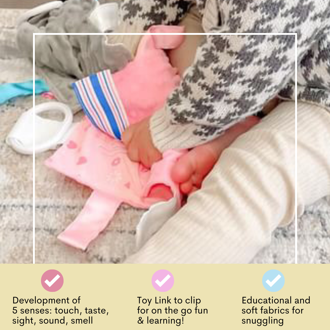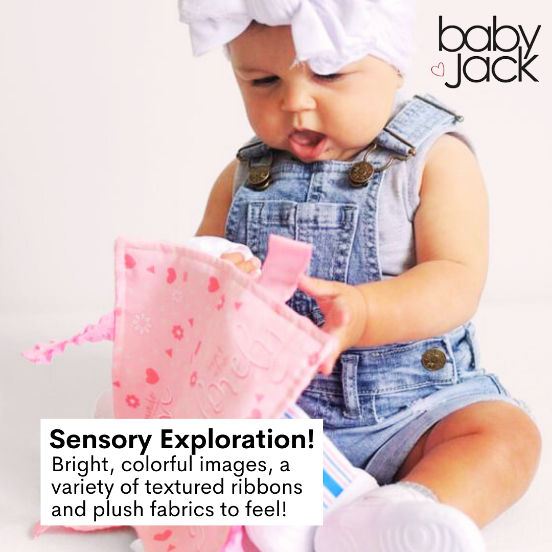 This is the gift to give a newborn baby as it is a wonderful keepsake with a hospital baby blanket ribbon in pink & blue stripes! A 8x8 sensory square tag toy that will keep baby busy and entertained for tummy time, in the stroller or gazing above in their crib. Sensory visual stimulation from the bright, modern colors + learning prints with hidden shapes. Tactile play with the variety of ribbon tags and comfort received from the soft textured minky dot. Babies also love the crackling crinkle paper too! Comes with a toy link to attach to car seat, stroller and for best retail display.