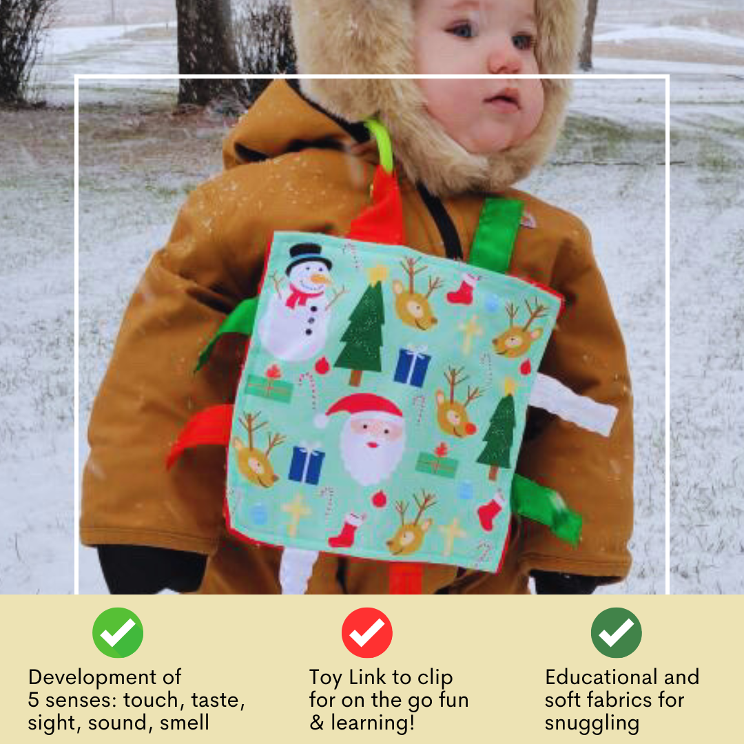 Celebrate the holiday season with sensory fun and learning! The Learning Lovey Christmas 8x8 Crinkle Tag Toy by Baby Jack is a festive, interactive sensory toy designed to comfort, entertain, and engage your little one.