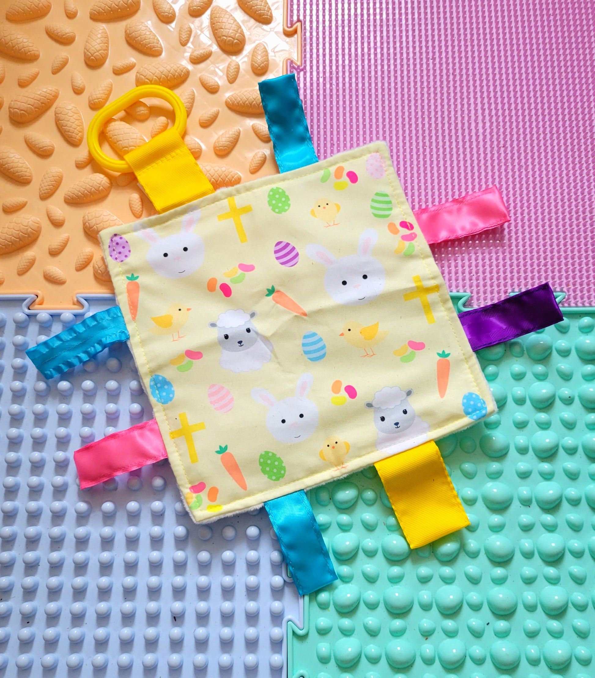 The NEW Easter Crinkle 8x8 Tag Square is a perfect gift for your little one's bunny baskets. The adorable pastel color palette will entice the sense of sight and evoke baby's development. The fluffy friends of bunnies, ducks, lambs and sheep will excite your little one. Touch and feel the soft textured minky plush backing for added sensory stimulation.
