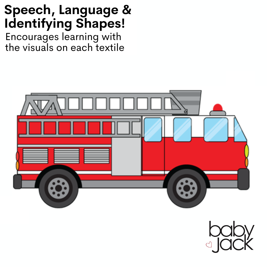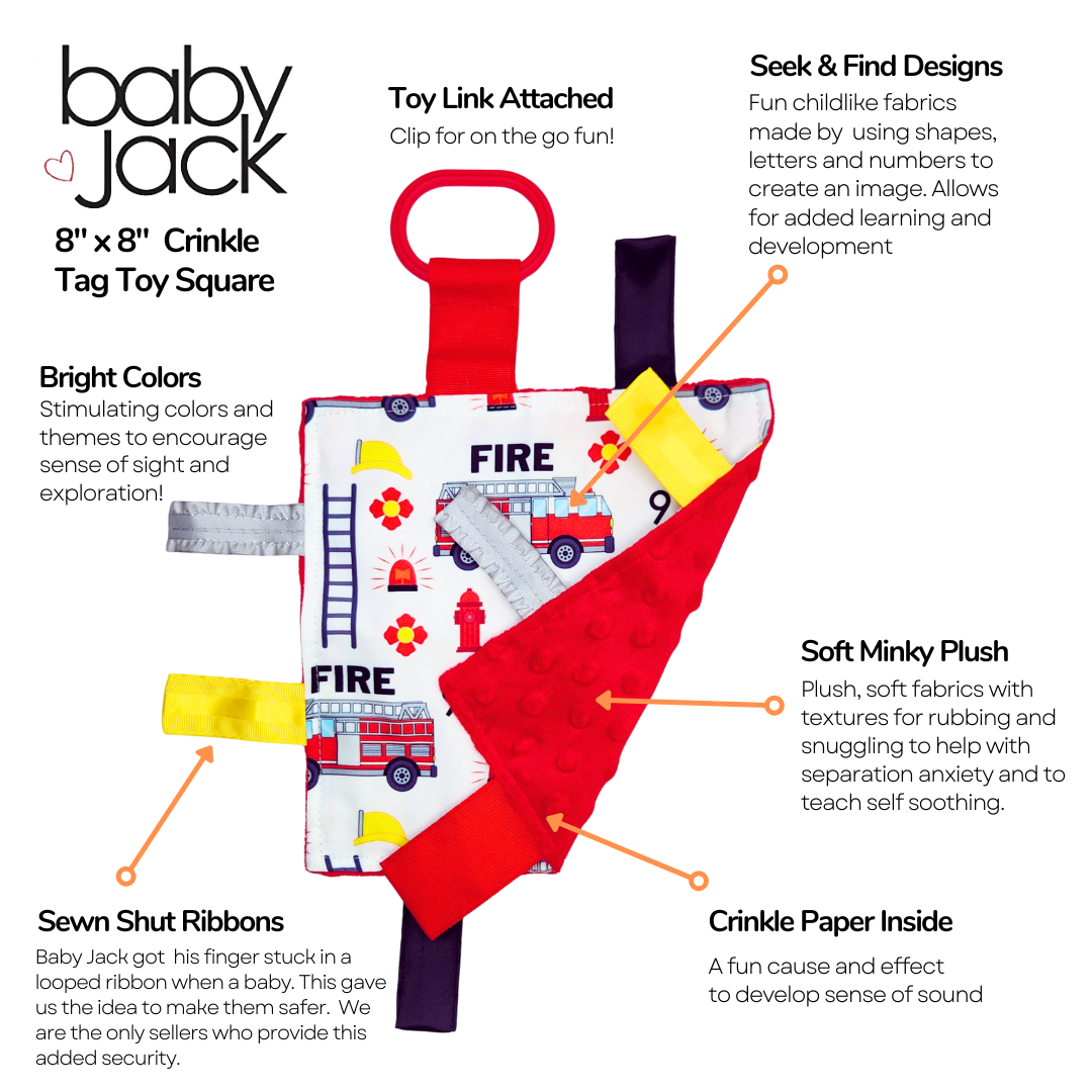 Show your child the importance of fire safety and the brave firemen that protect us with our Fire Learning Lovey Collection. It's the perfect security blanket that will last you forever. As your child grows up, the patterns will encourage your child to learn basic shapes, colors, letters, and numbers. The Learning Lovey is accented with coordinating ribbons that are sewn shut, so little fingers do not get intertwined in the ribbon loops. The variety of textured ribbons and fabrics encourage tactile play and help children develop cognitively, socially and emotionally through sensory interaction.