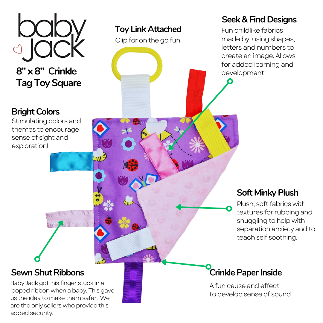 Each Learning Lovey comes with a toy link to clip onto strollers, car seats, or baby carriers. Since we care about the health of your children, we make our toy links non-toxic and BPA-free. The top fabric is a durable, micro polyester, paired with a minky plush fleece textured backing.