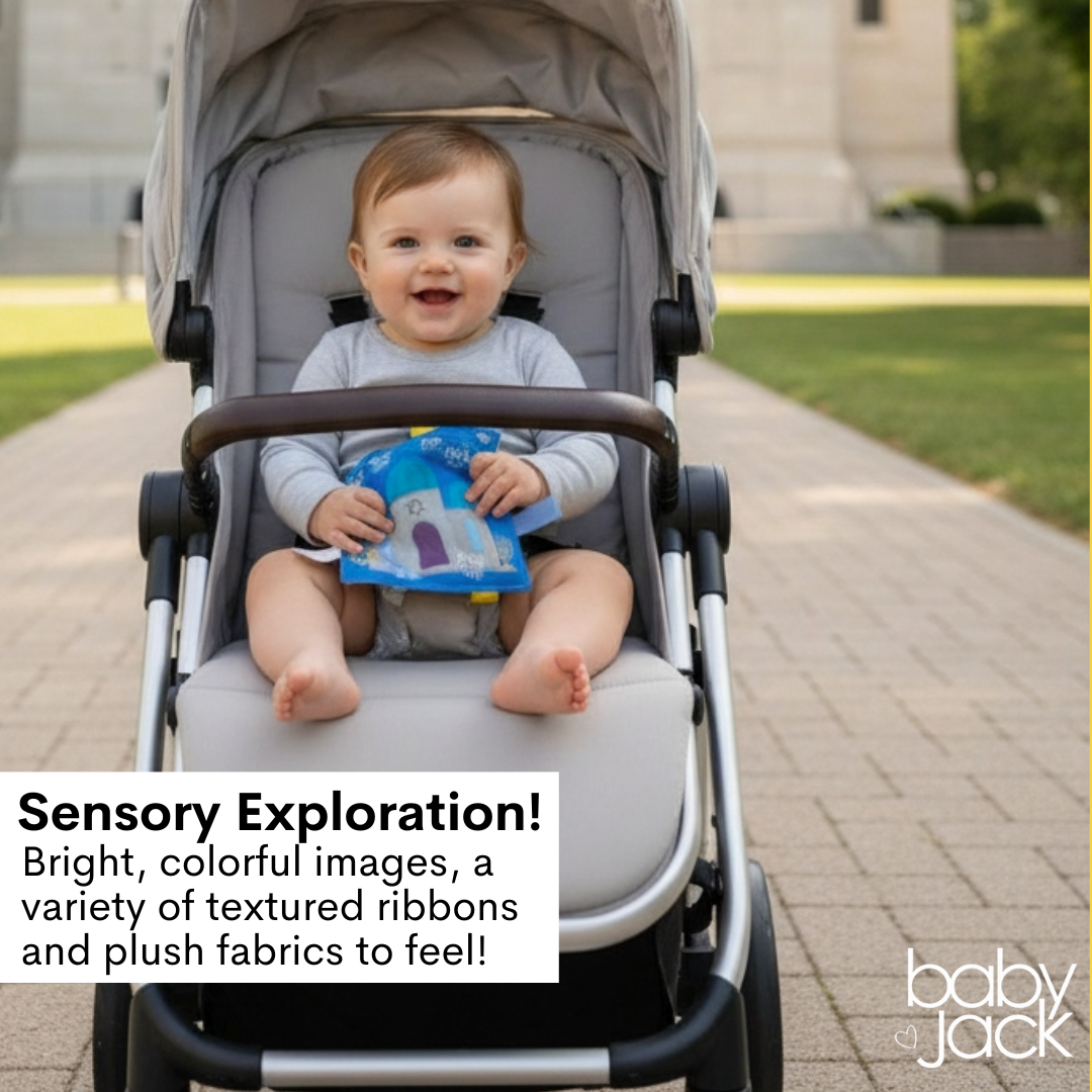 Sensory visual stimulation from the bright, modern colors + learning prints with hidden shapes. Tactile play with the variety of ribbon tags and comfort received from the soft textured minky dot. Babies also love the crackling crinkle paper too! Comes with a toy link to attach to car seat, stroller and for best retail display.