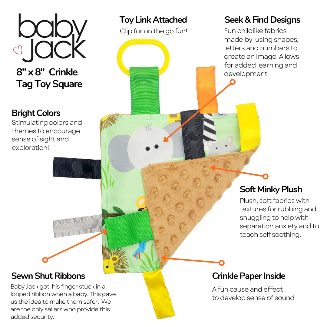 It's the perfect security blanket that will last you forever and cherish those memories of your little ones first zoo visit. The roars of a lion, monkey sounds and the way they tried to say "elephant". As your child grows up, the patterns will encourage your child to learn basic shapes and colors. The Learning Lovey is accented with coordinating ribbons that are sewn shut, so little fingers do not get intertwined in the ribbon loops. The variety of textured ribbons and fabrics encourage tactile play and help children develop cognitively, socially and emotionally through sensory interaction.