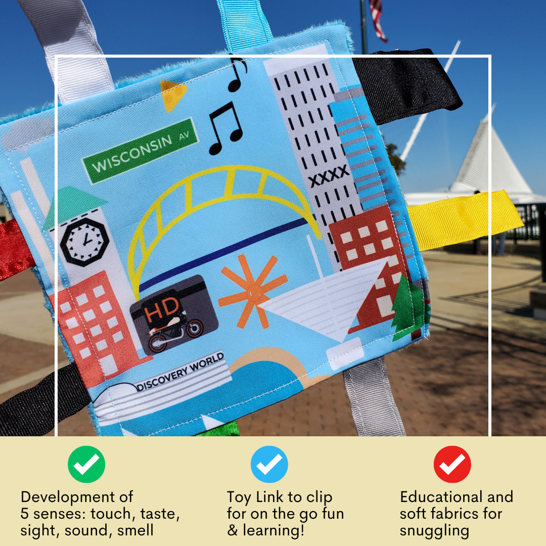 Community is important. Teach your child about popular landmarks in their town. Recognizable buildings, monuments and staples that shape their childhood. As your child grows up, the patterns will encourage your child to learn basic shapes and colors used to design all that they see in their city. The Square is accented with coordinating ribbons that are sewn shut, so little fingers do not get intertwined in the ribbon loops. The variety of textured ribbons and fabrics encourage tactile play and help children develop cognitively, socially and emotionally through sensory interaction.