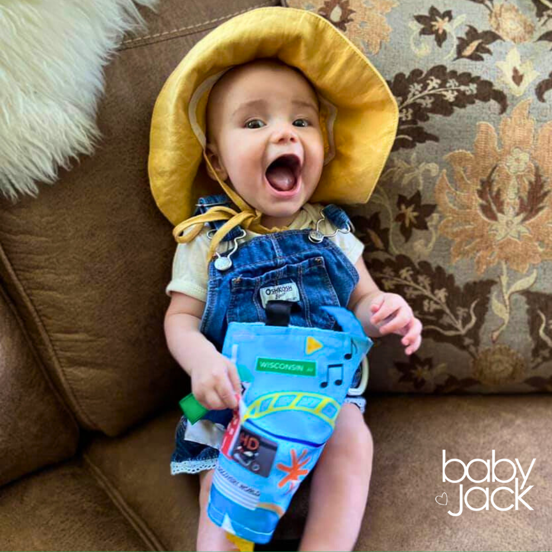 Each Learning Lovey 8"x 8" square comes with a toy link to clip onto strollers, car seats, or baby carriers and has crinkle crackling fabric to evoke the sense of hearing. Since we care about the health of your children, we make our toy links non-toxic and BPA-free. The top fabric is a durable, micro polyester, paired with a minky plush fleece textured backing. Washable - hand OR machine wash cold, air dry suggested.