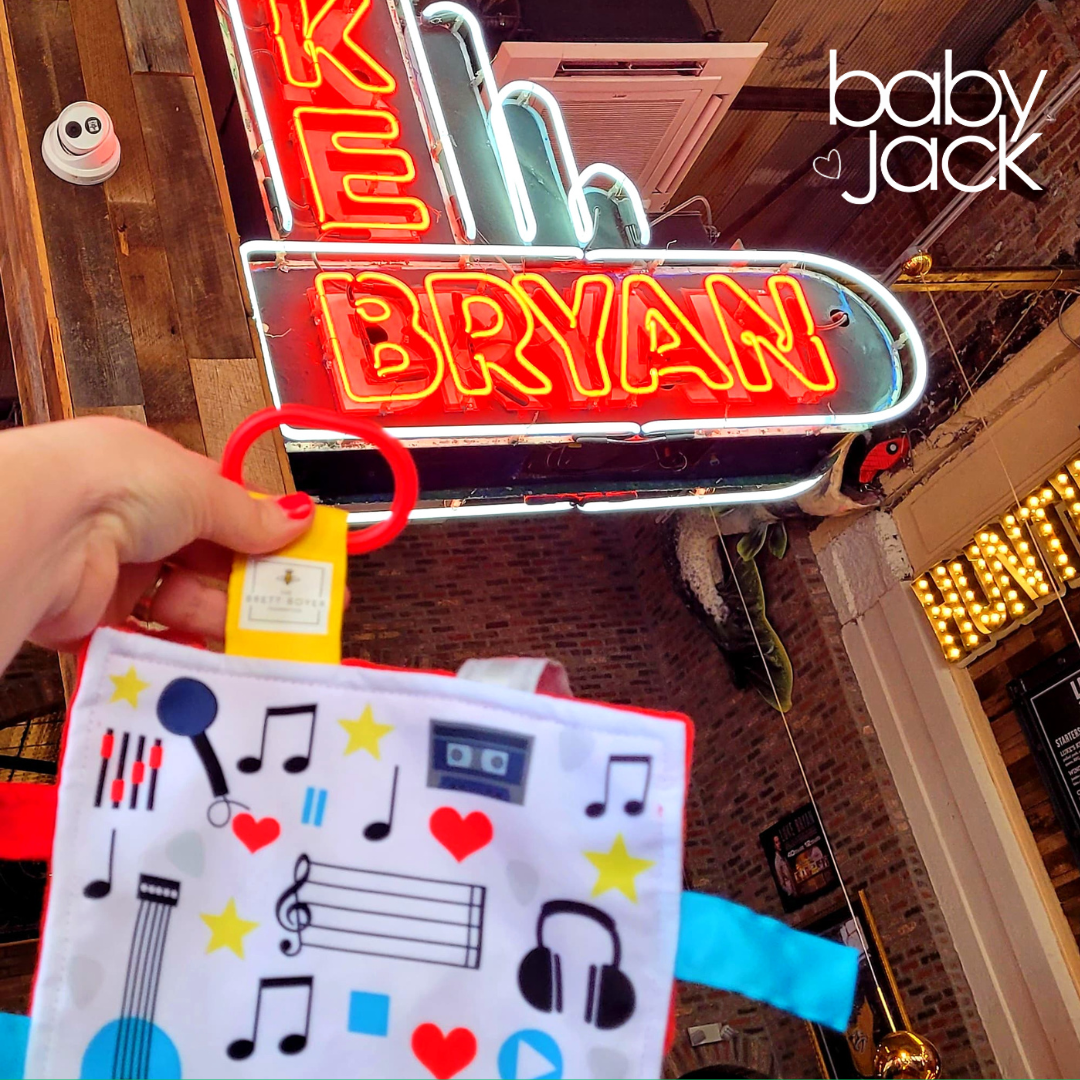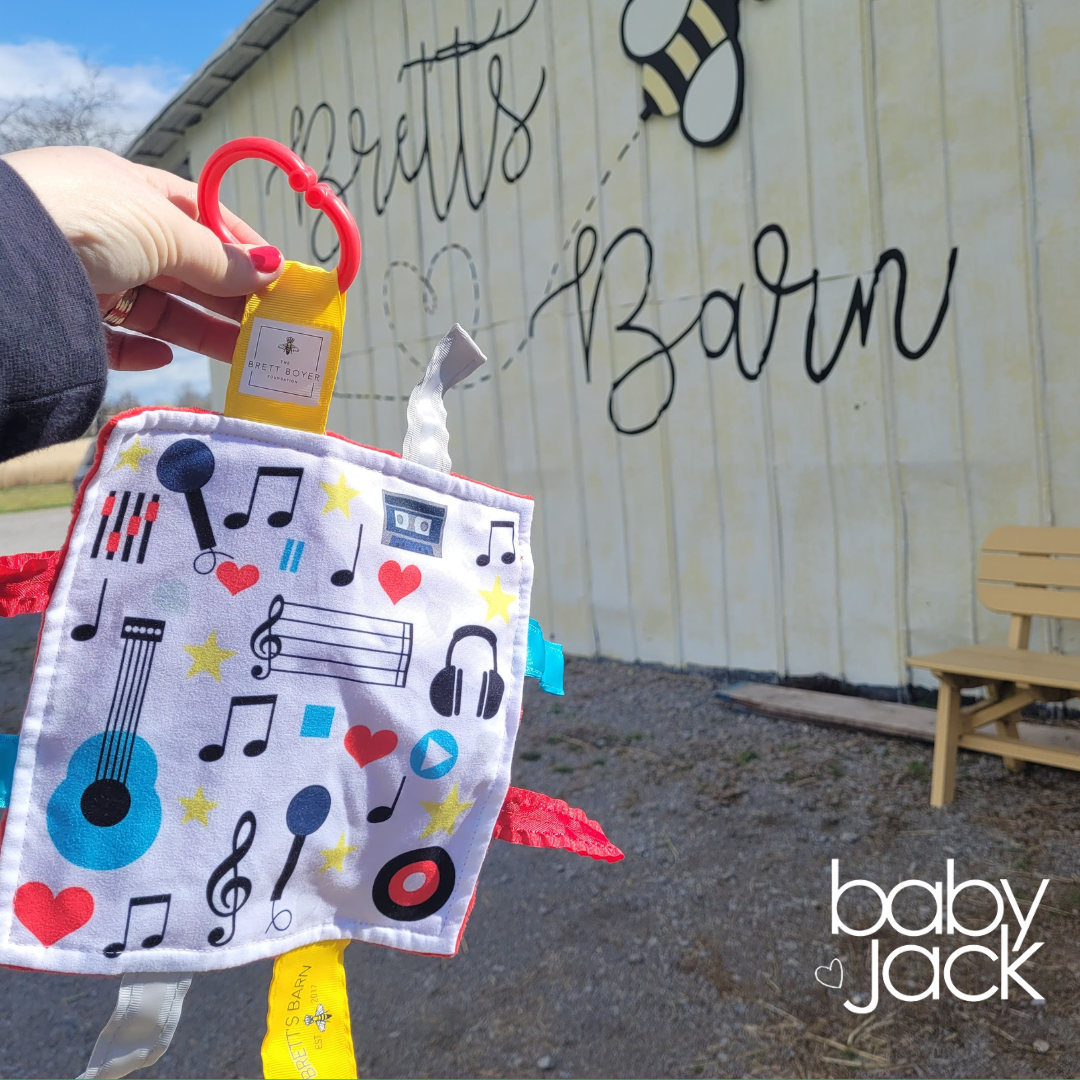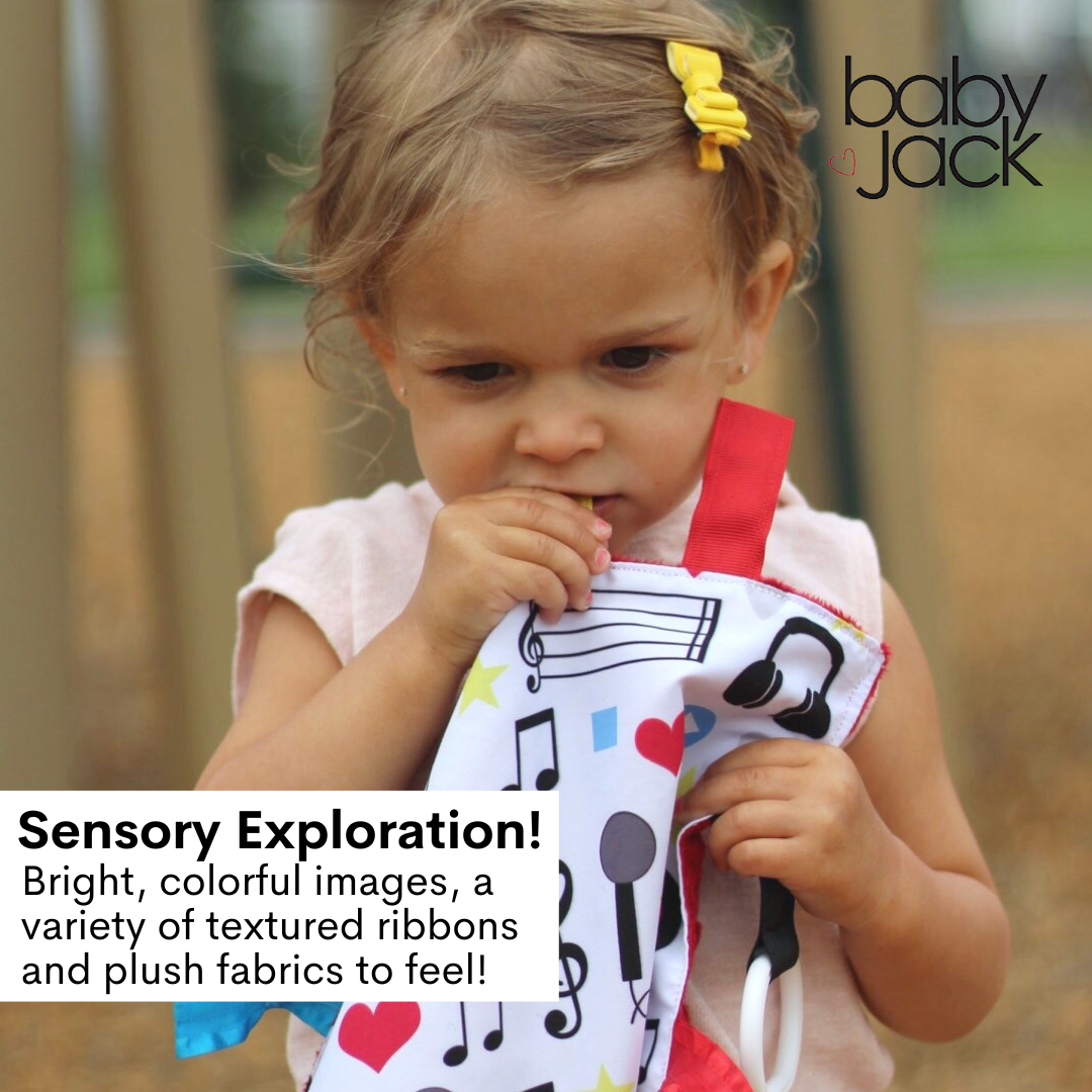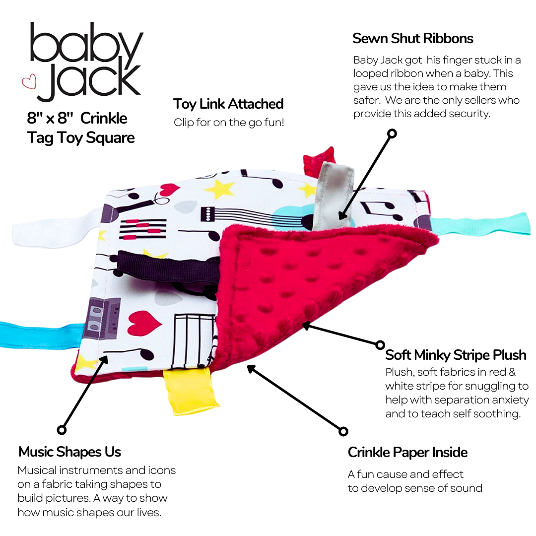 Each Baby Jack Crinkle Toy has ribbons sewn shut for additional safety and for little ones to fidget and rub. This provides a sensory stimulation and helps with self regulating and soothing. A Toy link to clip to the car seat, stroller or carrier is attached for easy travel.