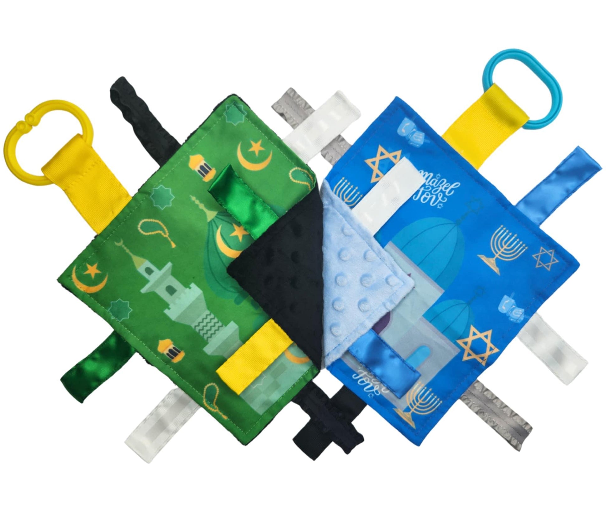Sensory visual stimulation from the bright, modern colors + learning prints with hidden shapes. Tactile play with the variety of ribbon tags and comfort received from the soft textured minky dot. Babies also love the crackling crinkle paper too! Comes with a toy link to attach to car seat, stroller and for best retail display.