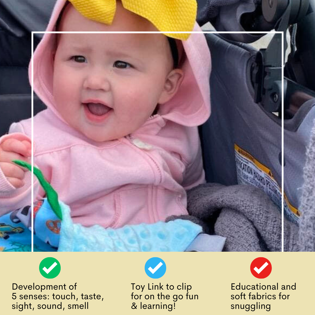 Each Learning Lovey 8"x 8" square comes with a toy link to clip onto strollers, car seats, or baby carriers and has crinkle crackling fabric to evoke the sense of hearing. Since we care about the health of your children, we make our toy links non-toxic and BPA-free. The top fabric is a durable, micro polyester, paired with a minky plush fleece textured backing. Washable - hand OR machine wash cold, air dry suggested.