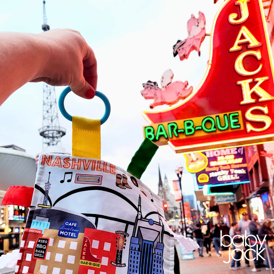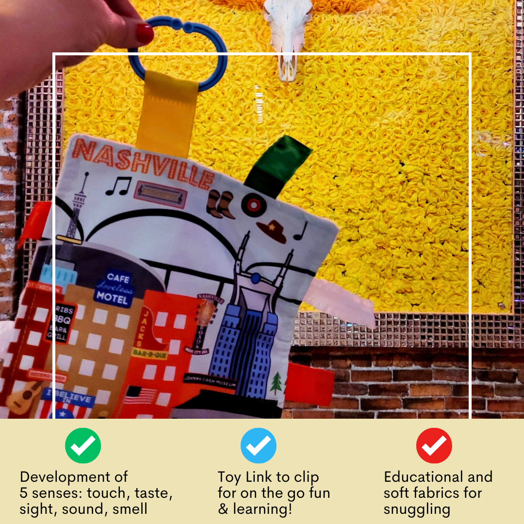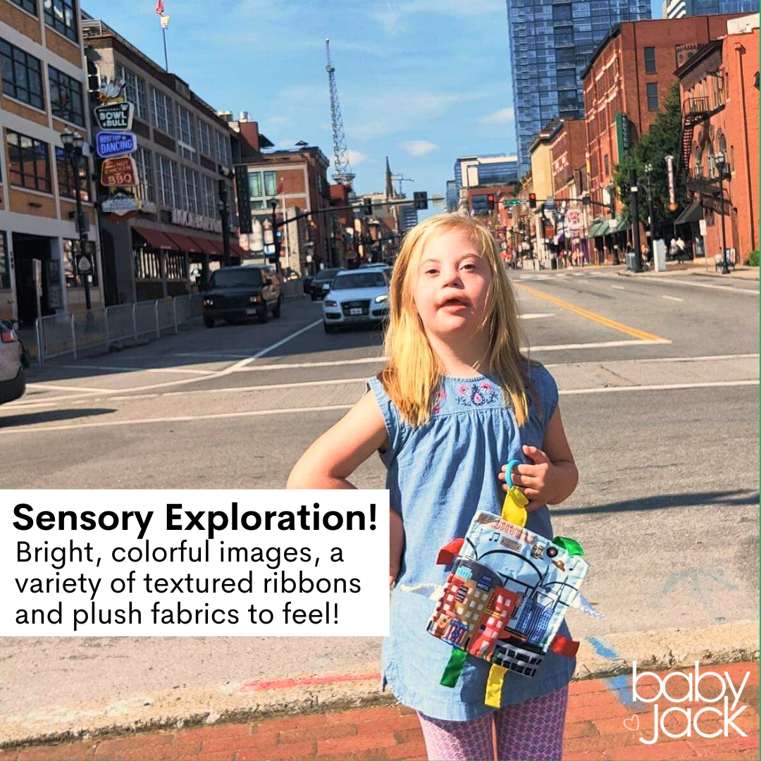 Community is important. Teach your child about popular landmarks in their town. Recognizable buildings, monuments and staples that shape their childhood. As your child grows up, the patterns will encourage your child to learn basic shapes and colors used to design all that they see in their city. The Square is accented with coordinating ribbons that are sewn shut, so little fingers do not get intertwined in the ribbon loops. The variety of textured ribbons and fabrics encourage tactile play and help children develop cognitively, socially and emotionally through sensory interaction.