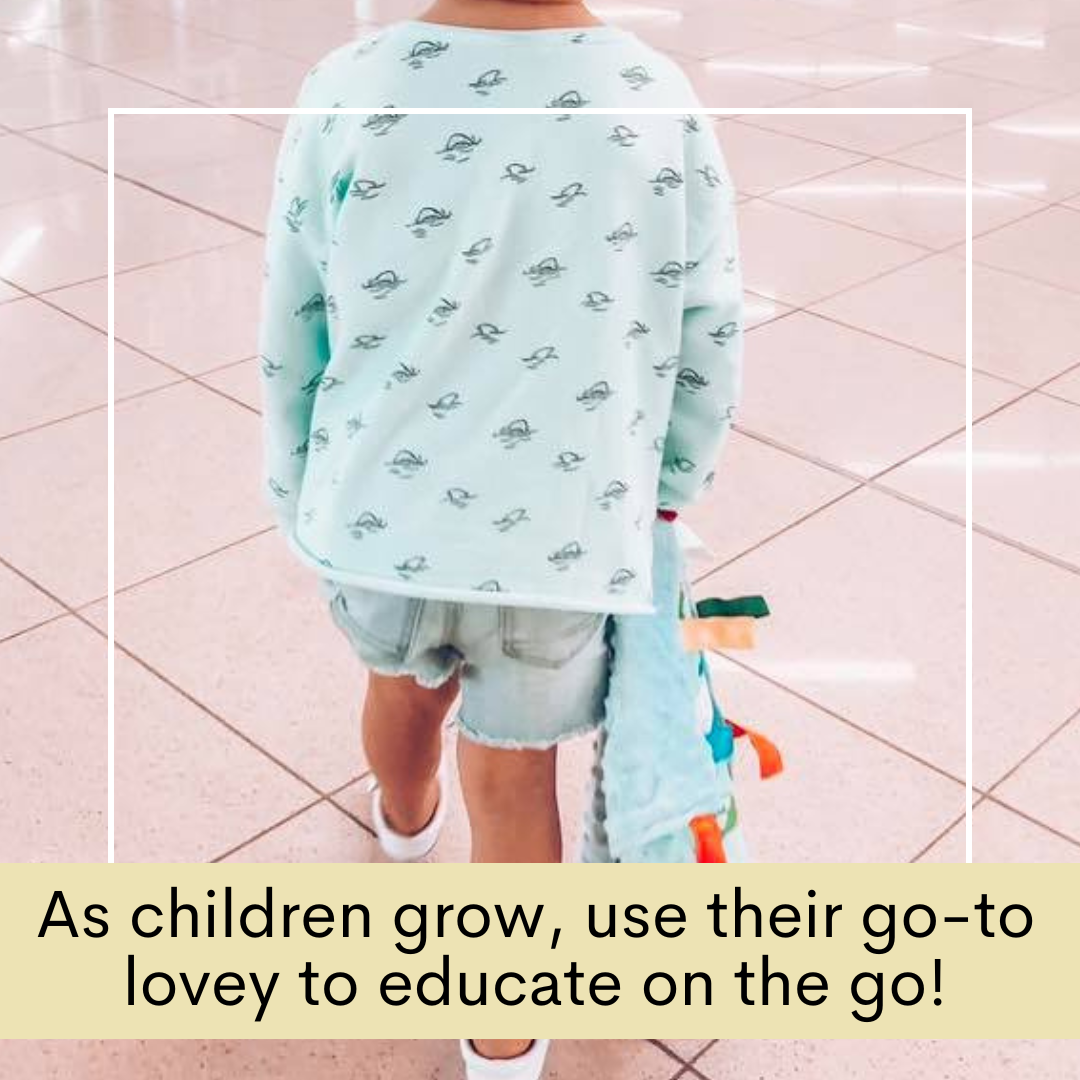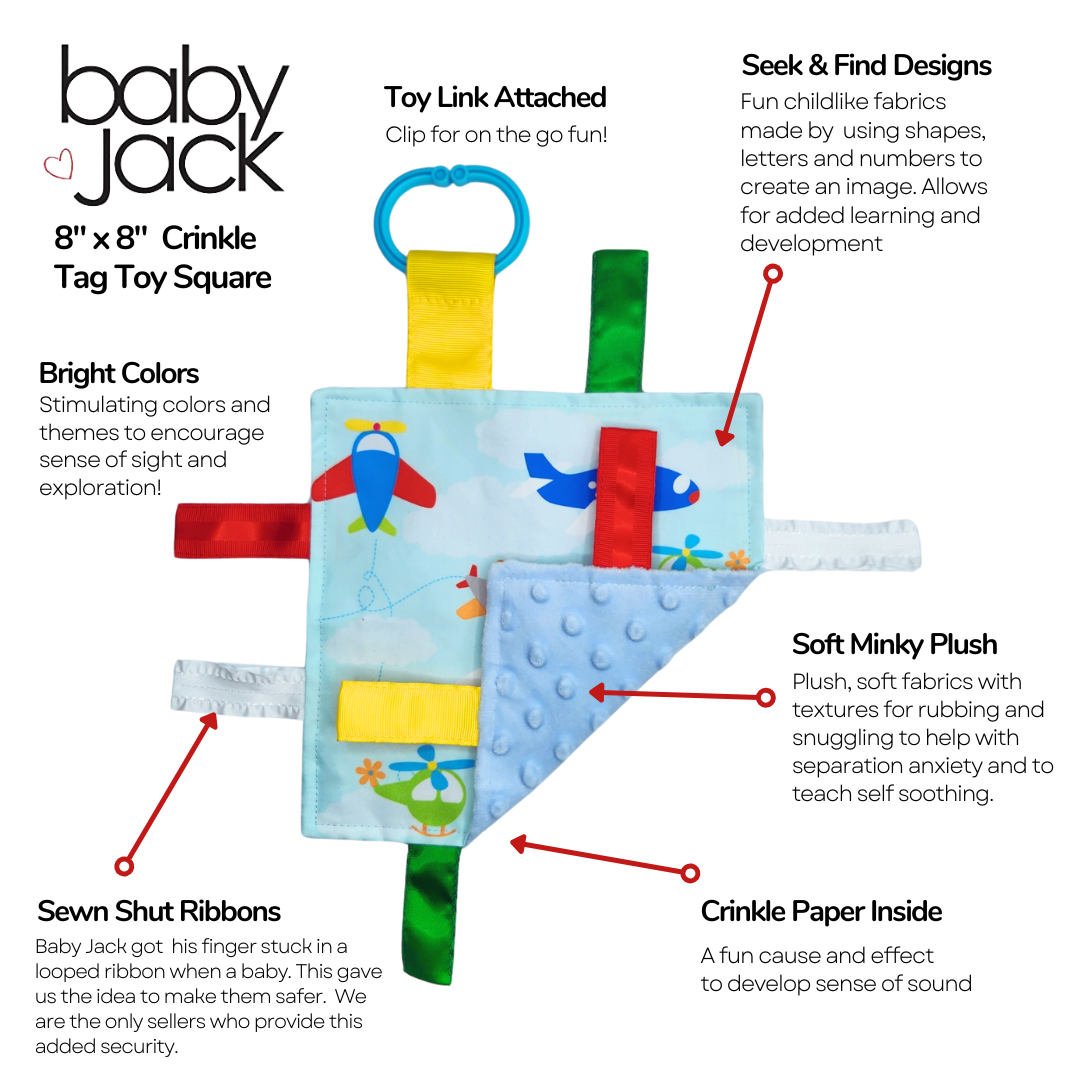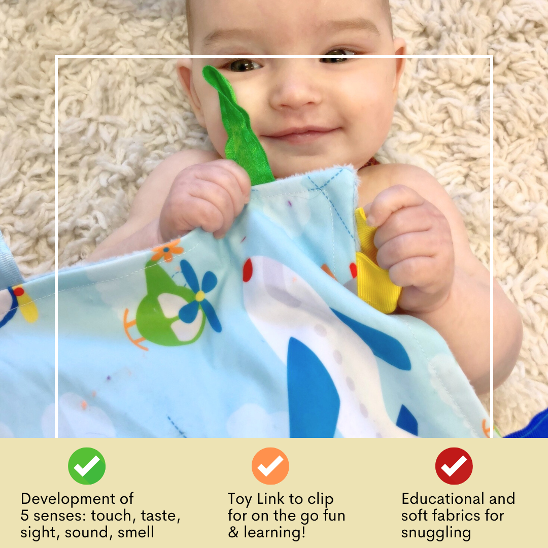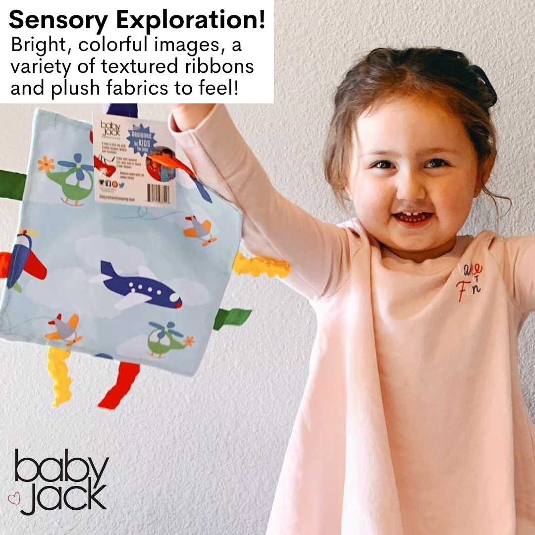 Fly high with our airplane learning lovey collection, encouraging a love for travel! It's the perfect security blanket that will last you forever. As your child grows up, the patterns will encourage your child to learn basic shapes and colors. The Learning Lovey is accented with coordinating ribbons that are sewn shut, so little fingers do not get intertwined in the ribbon loops. The variety of textured ribbons and fabrics encourage tactile play and help children develop cognitively, socially and emotionally through sensory interaction.