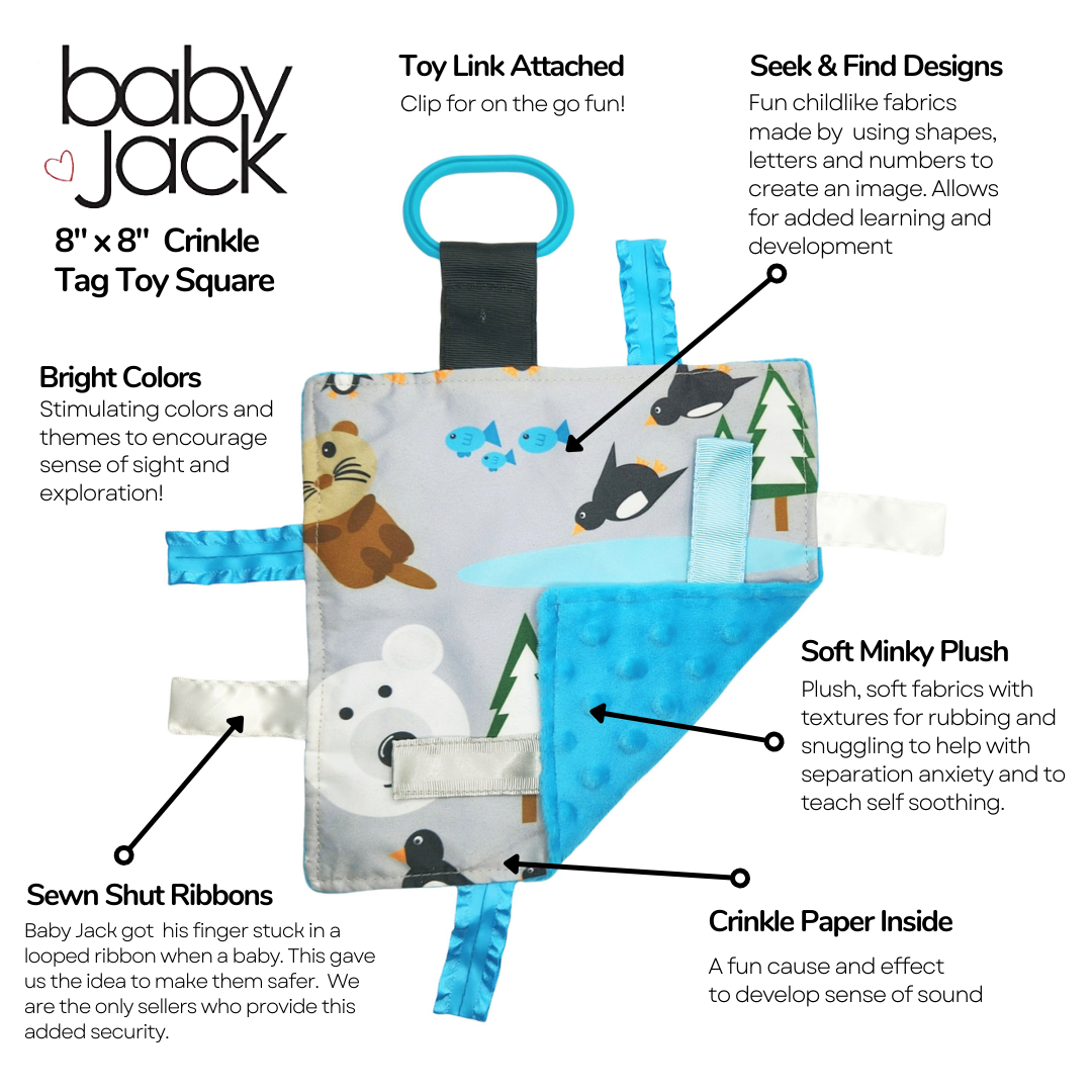 Each Learning Lovey comes with a toy link to clip onto strollers, car seats, or baby carriers. Since we care about the health of your children, we make our toy links non-toxic and BPA-free. The top fabric is a durable, micro polyester, paired with a minky plush fleece textured backing.