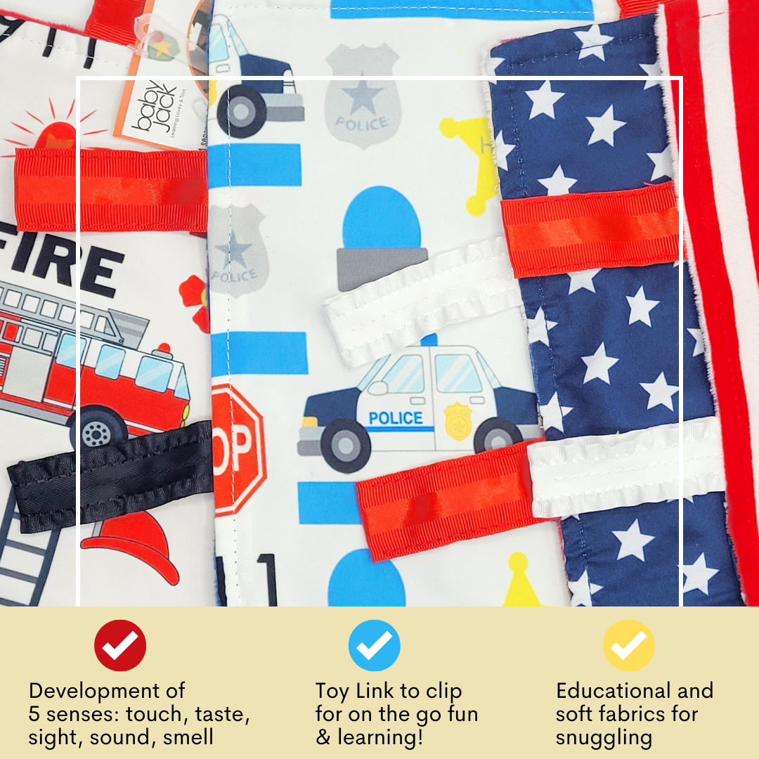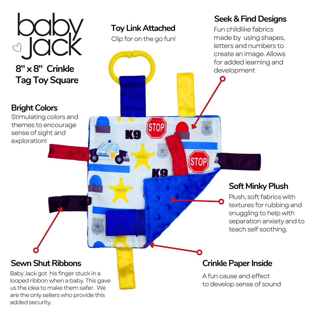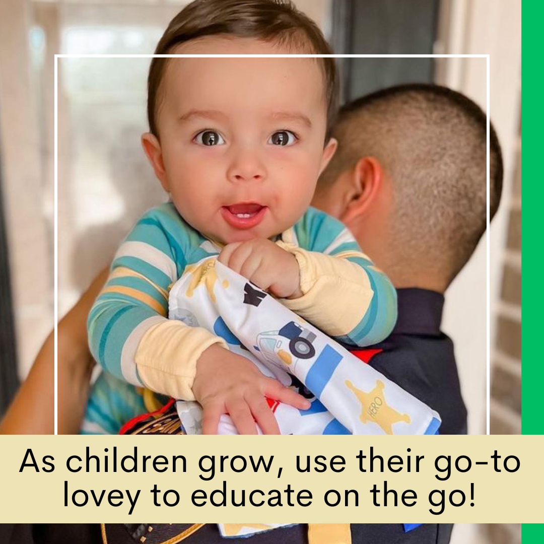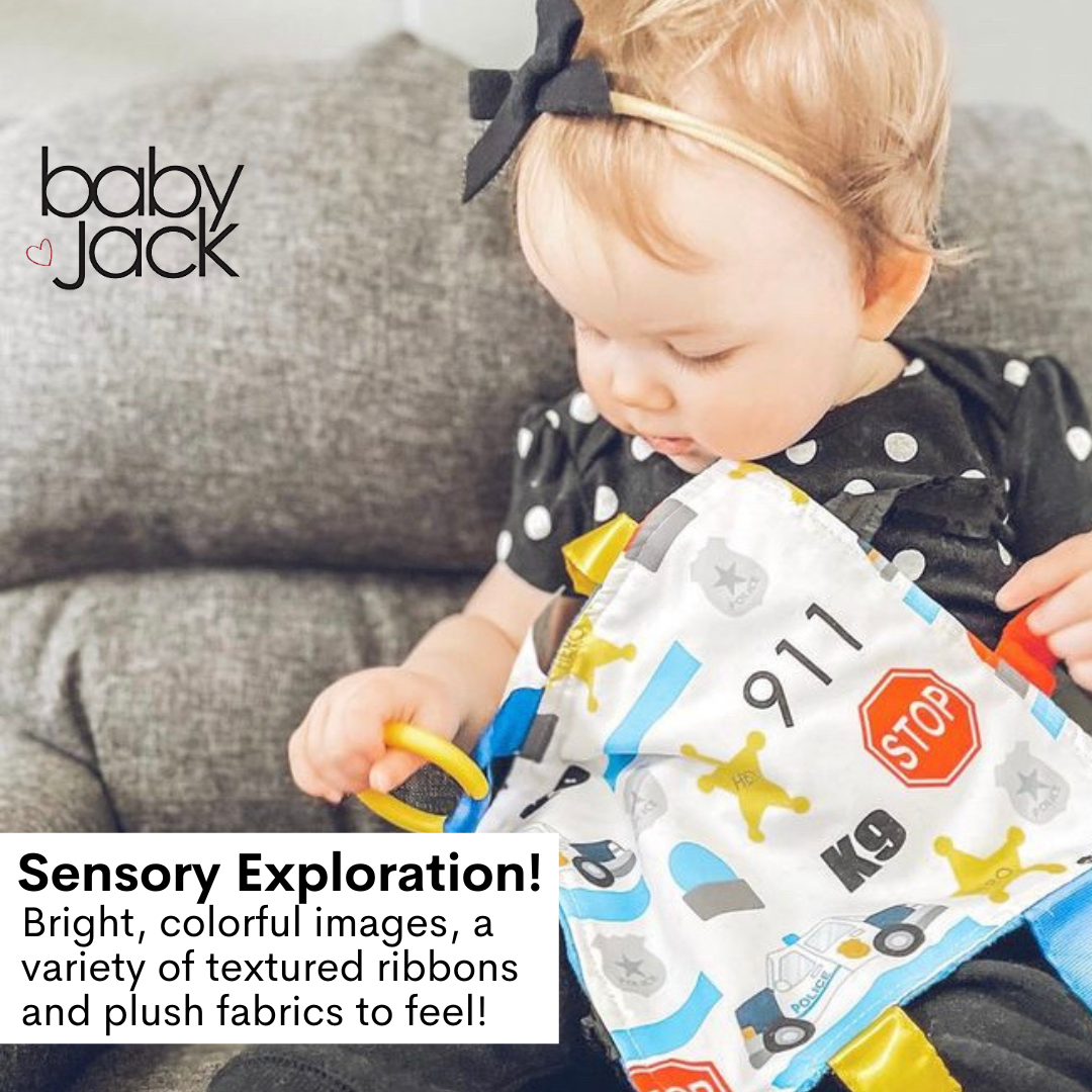 Teach your child the importance of our friends in blue with our Police Lovey! It's the perfect security blanket that will last you forever. As your child grows up, the patterns will encourage your child to learn basic shapes and colors. The Learning Lovey is accented with coordinating ribbons that are sewn shut, so little fingers do not get intertwined in the ribbon loops. The variety of textured ribbons and fabrics encourage tactile play and help children develop cognitively, socially and emotionally through sensory interaction.