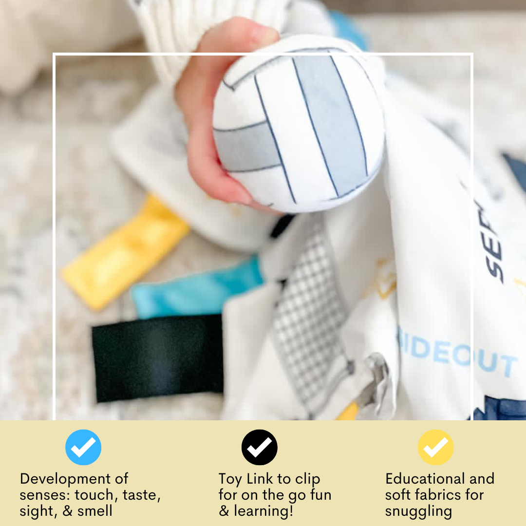 Teach your child at a young age about the game of volleyball and soon they will want to be mom or daddy's little setter! As your child grows up, the patterns will encourage your child to learn basic shapes, colors, letters, and numbers. The Learning Lovey is accented with coordinating ribbons that are sewn shut, so little fingers do not get intertwined in the ribbon loops. The variety of textured ribbons and fabrics encourage tactile play and help children develop cognitively, socially and emotionally through sensory interaction.