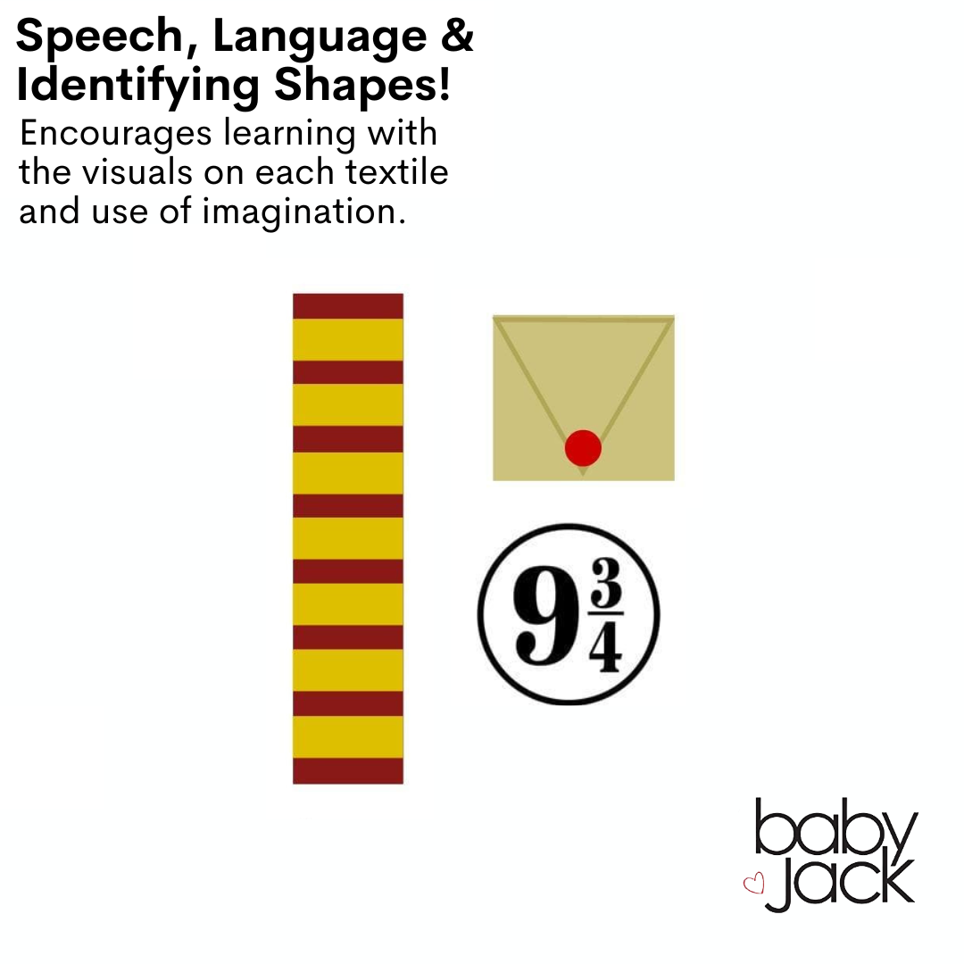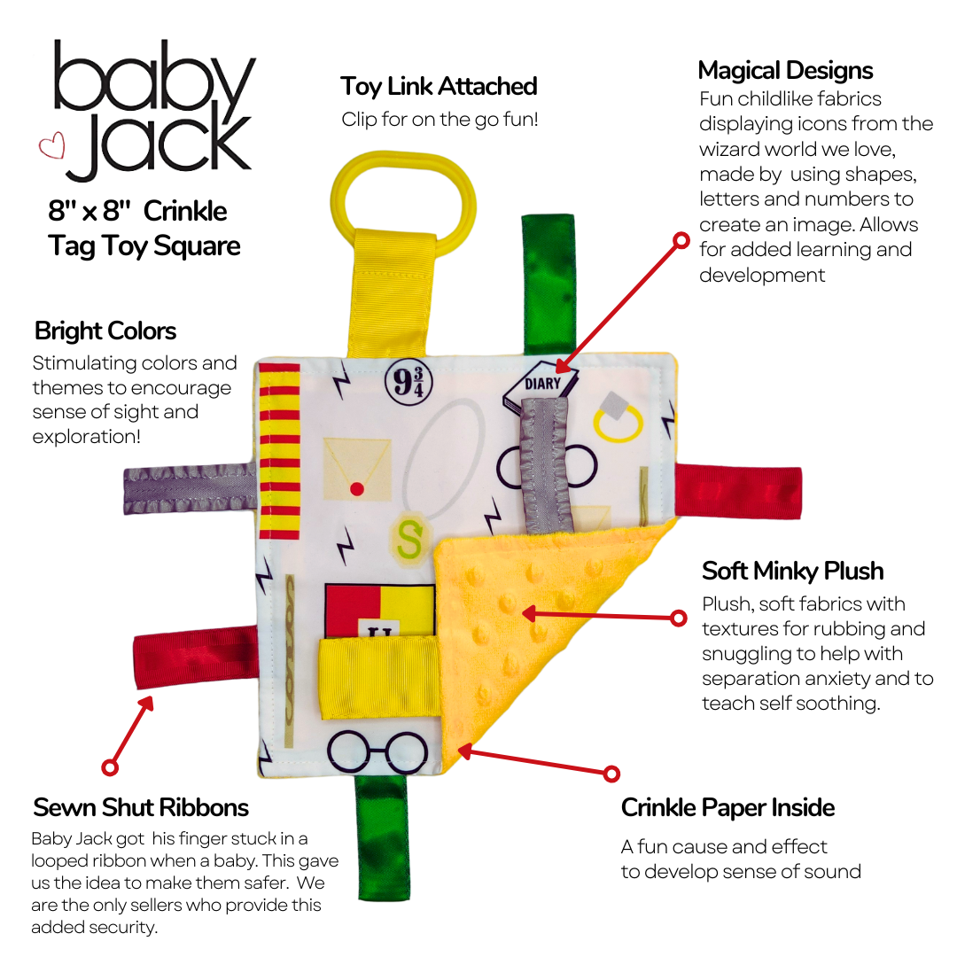 Show your love of wizardry and magic with our unique Wizard Lovey! It's the perfect security blanket that will last you forever and encourage your baby wizard to love those famous books and films just as you did. It is perfect for anyone who adores any story about magical wizards and witches. As your child grows up, the patterns will encourage your child to learn basic shapes and colors. The Learning Lovey is accented with coordinating ribbons that are sewn shut, so little fingers do not get intertwined in the ribbon loops. The variety of textured ribbons and fabrics encourage tactile play and help children develop cognitively, socially and emotionally through sensory interaction.