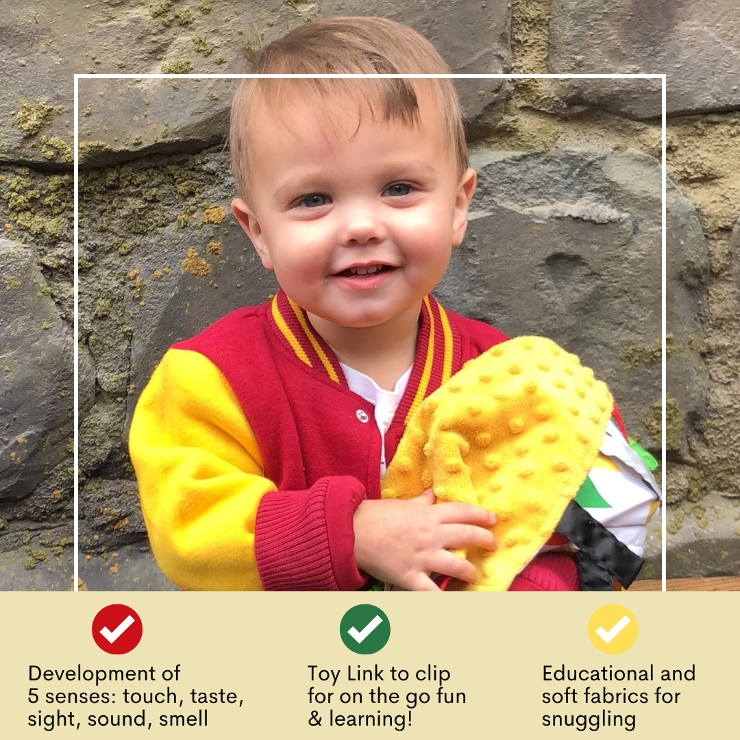 Each Learning Lovey comes with a toy link to clip onto strollers, car seats, or baby carriers. Since we care about the health of your children, we make our toy links non-toxic and BPA-free. The top fabric is a durable, micro polyester, paired with a minky plush fleece textured backing.
