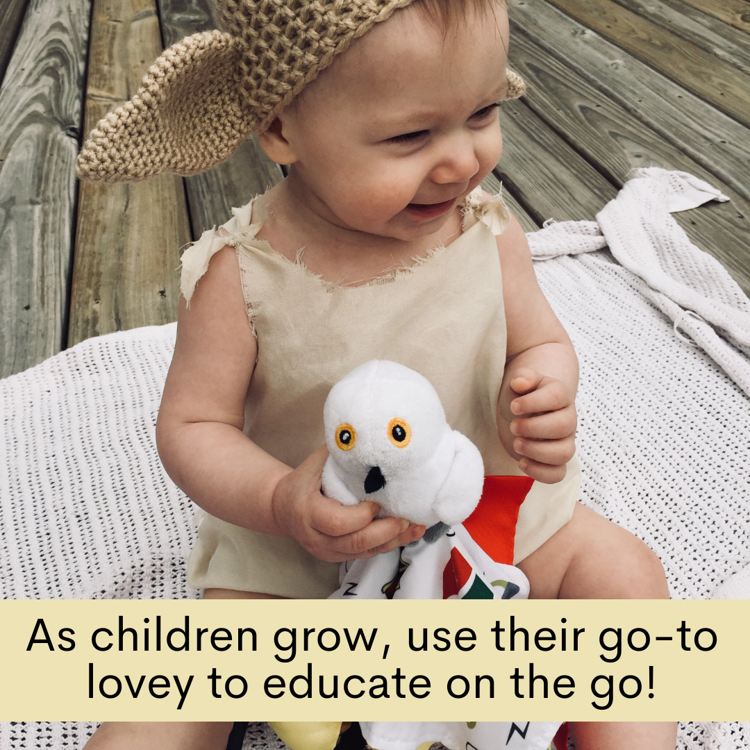 Show your love of wizardry and magic with our unique Wizard Lovey! It's the perfect security blanket that will last you forever and encourage your baby wizard to love those famous books and films just as you did. It is perfect for anyone who adores any story about magical wizards and witches. As your child grows up, the patterns will encourage your child to learn basic shapes and colors. The Learning Lovey is accented with coordinating ribbons that are sewn shut, so little fingers do not get intertwined in the ribbon loops. The variety of textured ribbons and fabrics encourage tactile play and help children develop cognitively, socially and emotionally through sensory interaction.